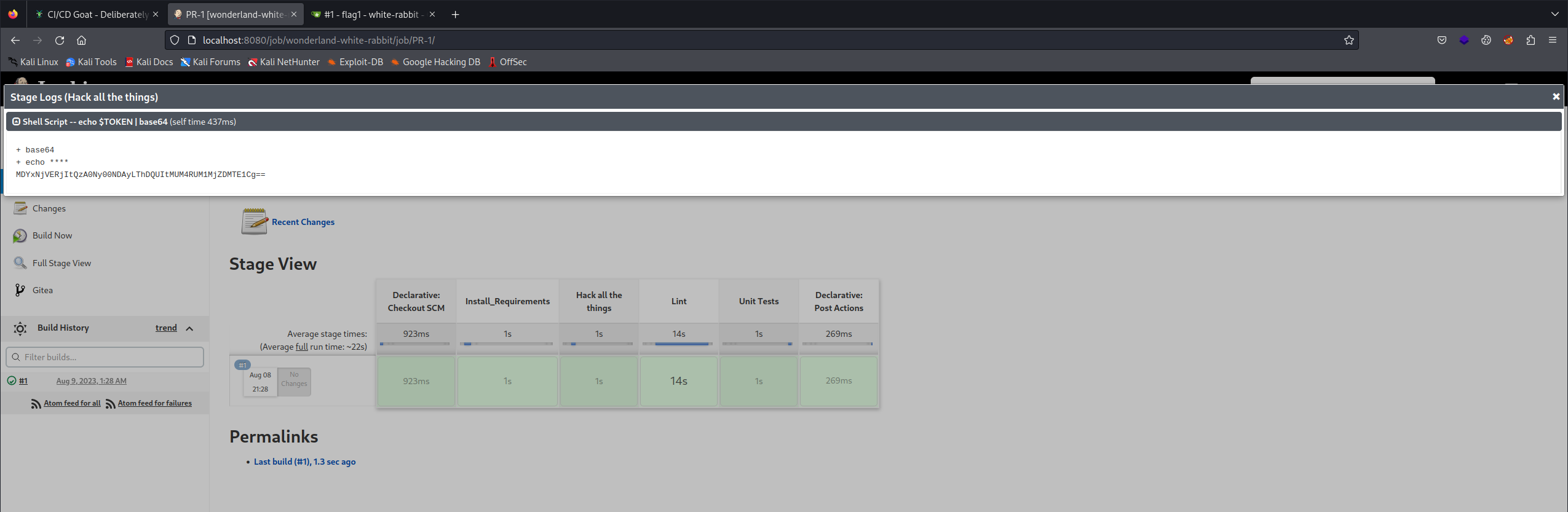 The withCredentials tells jenkins to use a credential from the Jenkins credential store and assign it to a variable, which can be used in the command. In this case, we are base64 encoding it, because Jenkins will automatically mask credentials in build logs. After making the changes, push your new branch, and open a pull request in Gitea to merge your changes into main. This will kick off a jenkins build with the new malicious build step. Log into Jenkins at http://localhost:8080 with the credentials alice:alice, go to the build logs for your PR, and view the logs for the stage you added. It should look something like this: